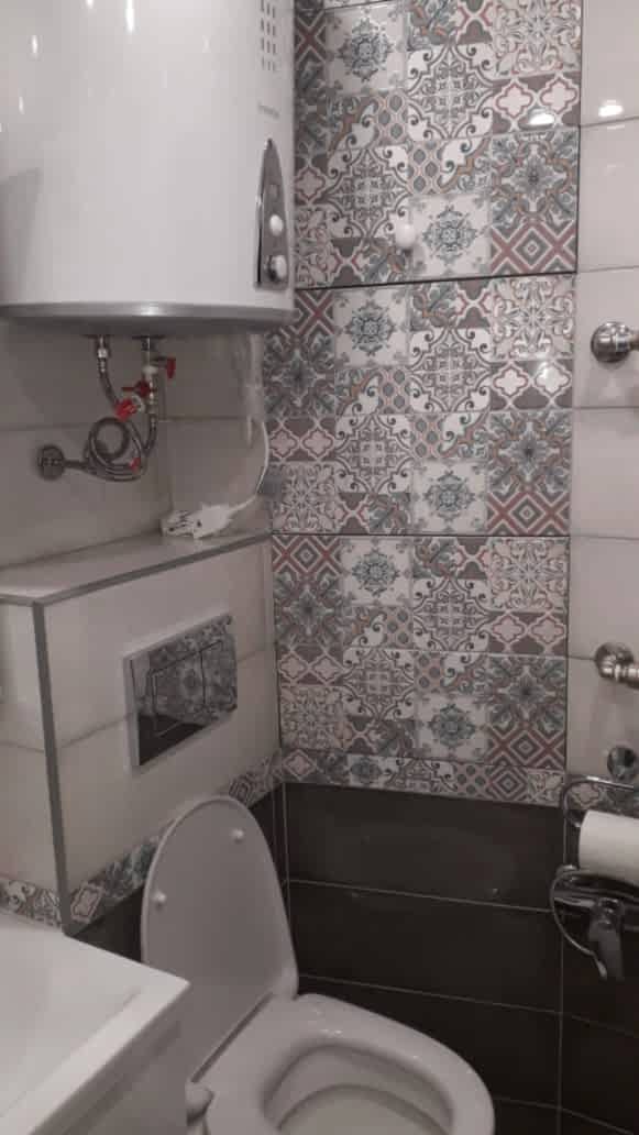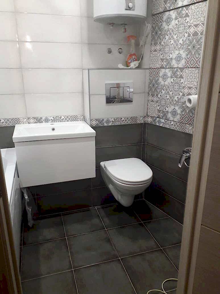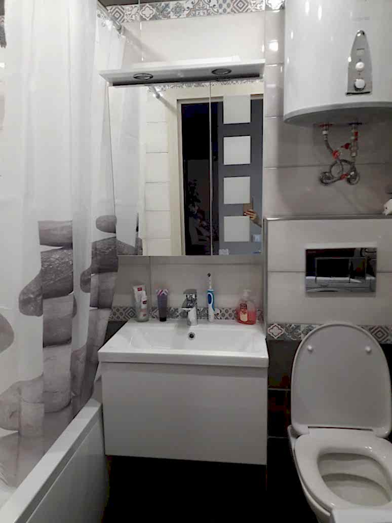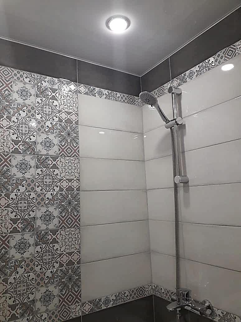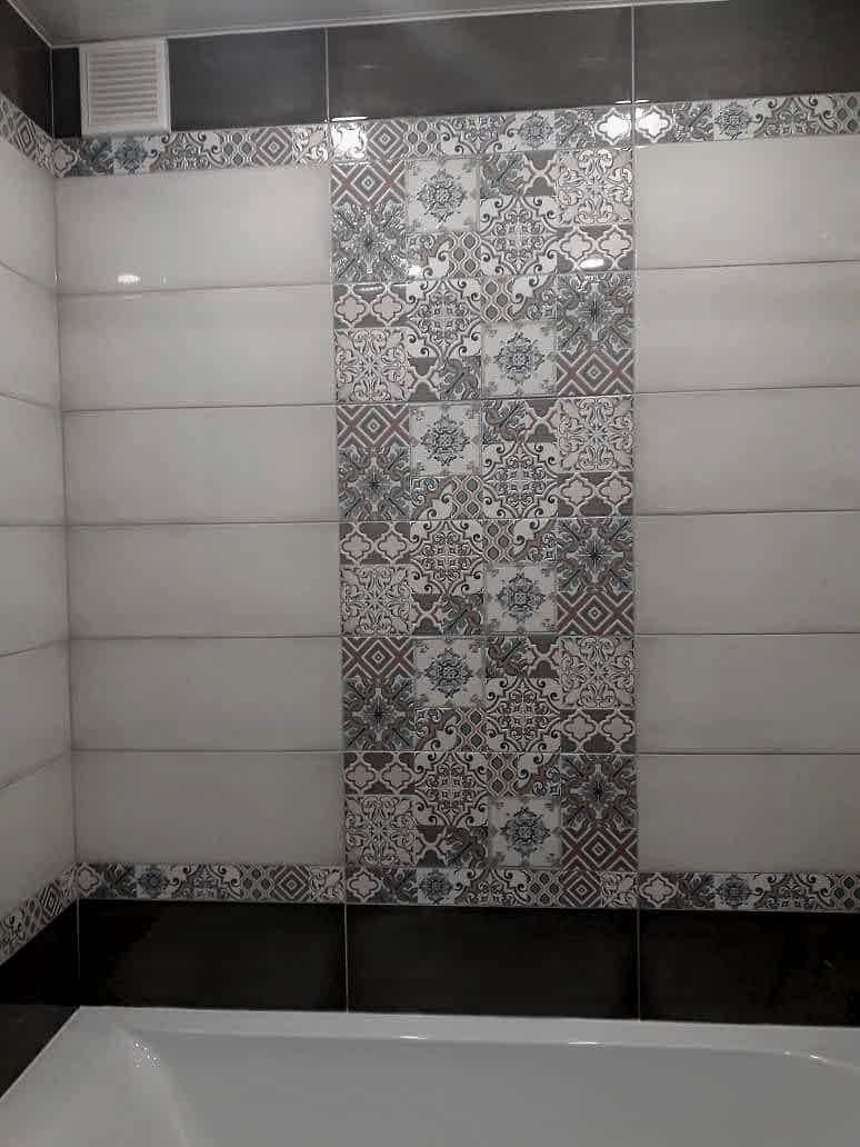 Ванная комната Пинап сочетание фактурного серого цвета в сочетании с мозаичным орнаментом.